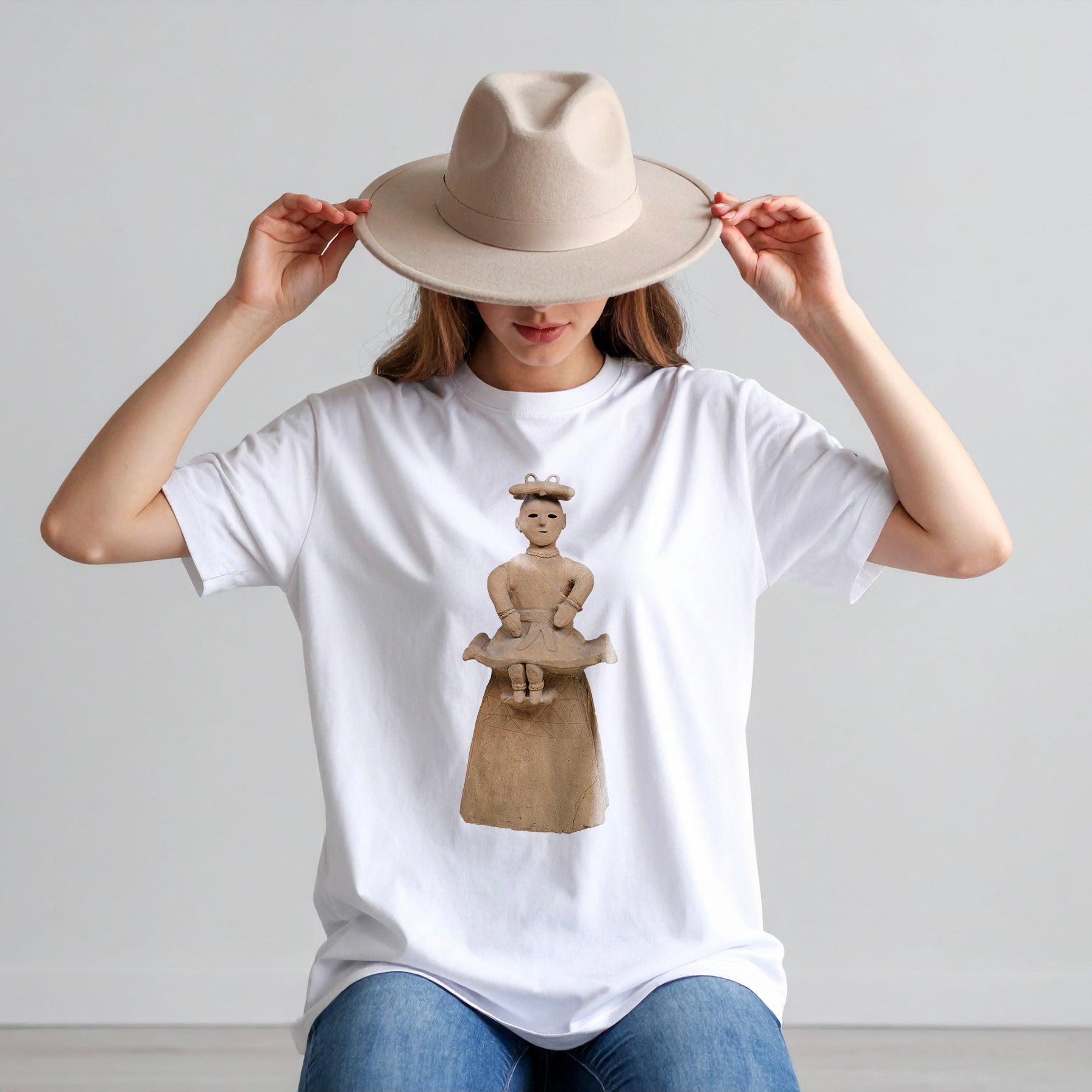 Haniwa are terracotta clay figures created during Japan’s Kofun period. This figure depicts a priestess seated on a rectangular chair, her small feet resting on a flat board attached to it. She wears a large topknot adorned with a vertical comb, along with round bead necklaces, bracelets, and anklets, and likely once had earrings. Dressed in a sash-style robe, she carries a bag with triangular patterns and a five-bell mirror on her left hip.