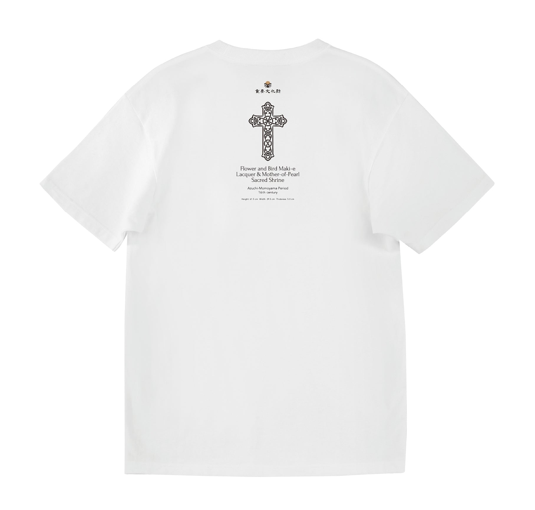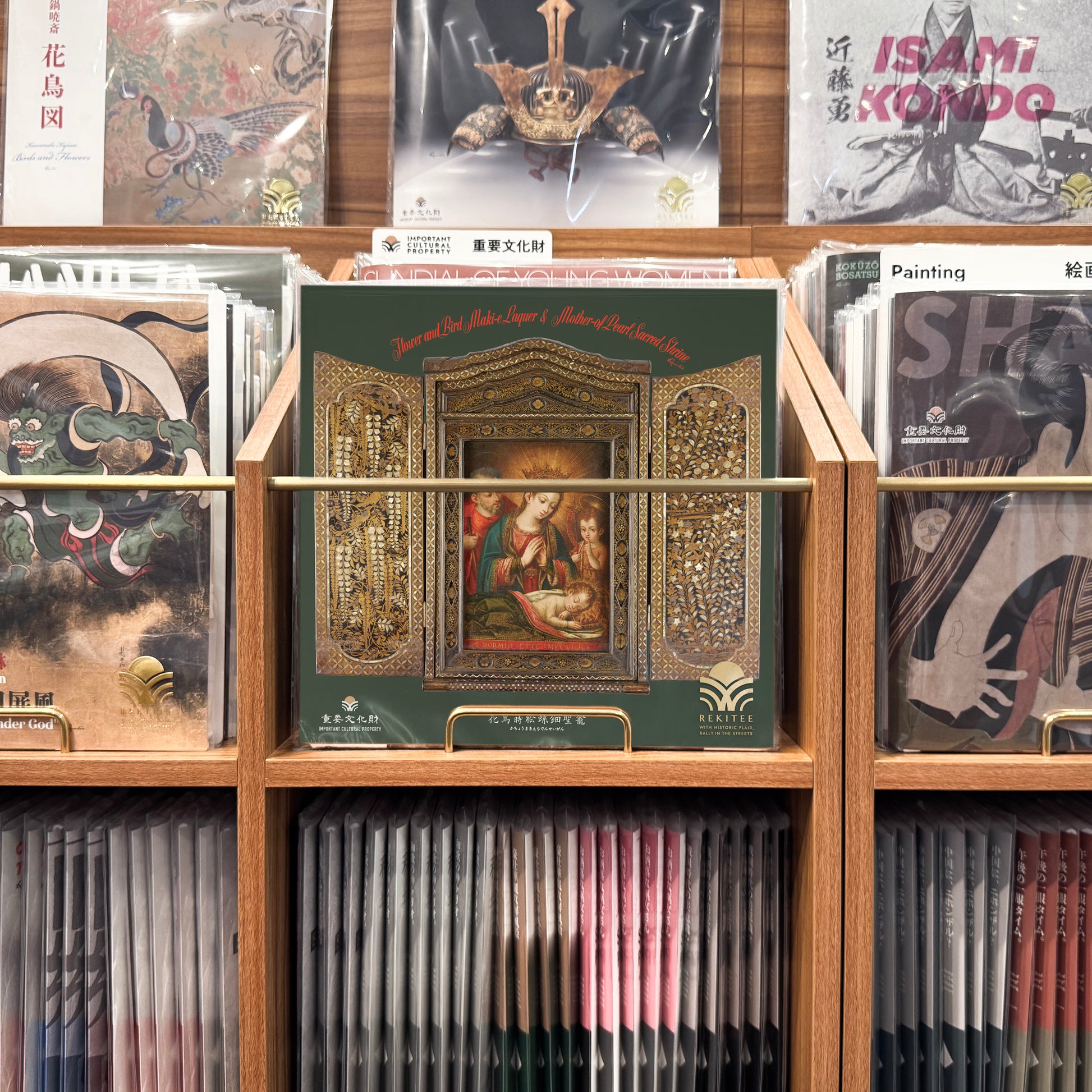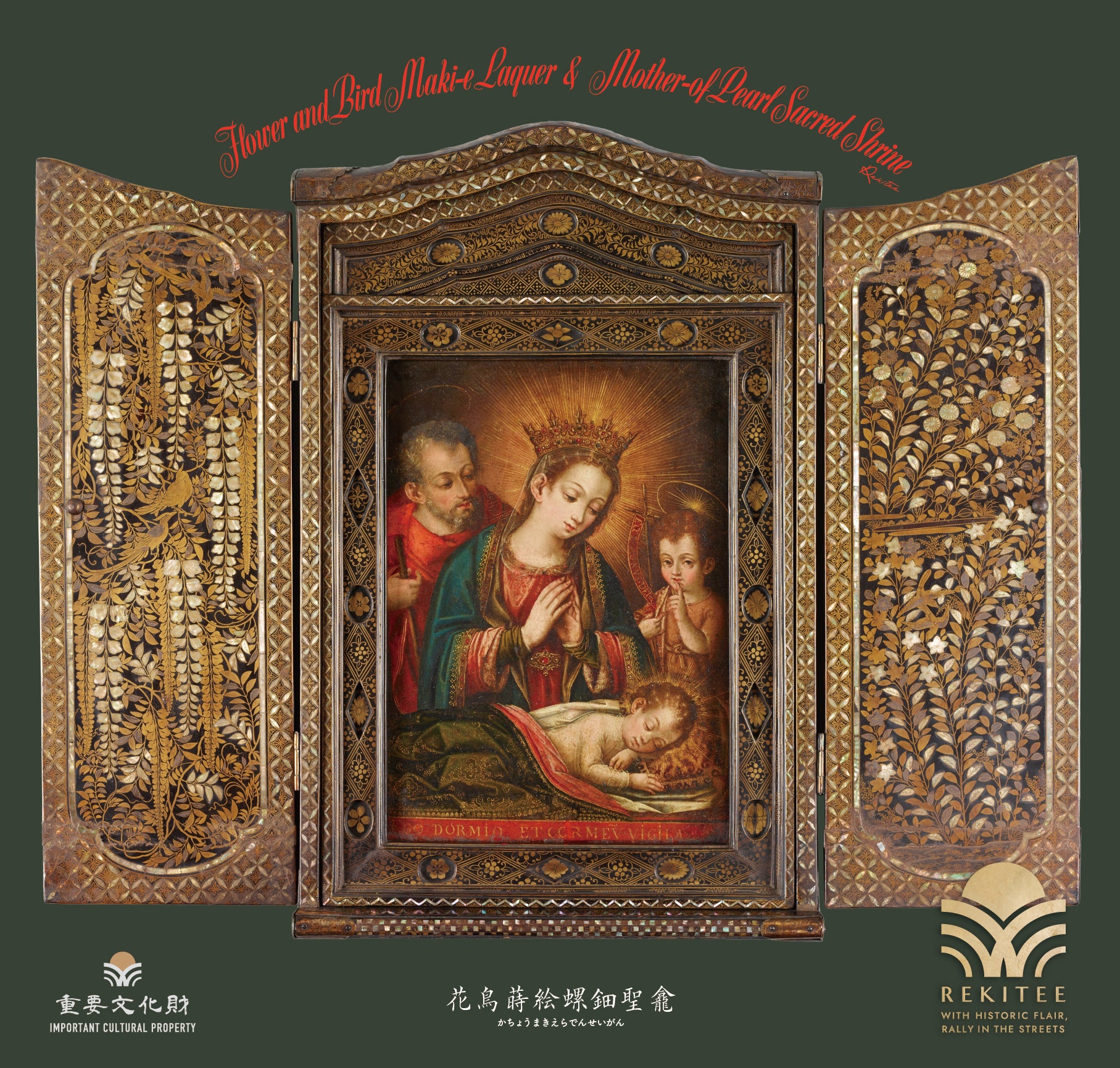 This 16th-century lacquerware piece, made for church rituals, belongs to the genre known as "Namban lacquerware," produced in Japan for export to Europe. Designed as a slender shrine, it uniquely blends Western aesthetics with traditional Japanese techniques, such as "maki-e" and mother-of-pearl inlay. At its center is a copperplate oil painting imported from Europe, depicting Mary, Christ, Joseph, and John.