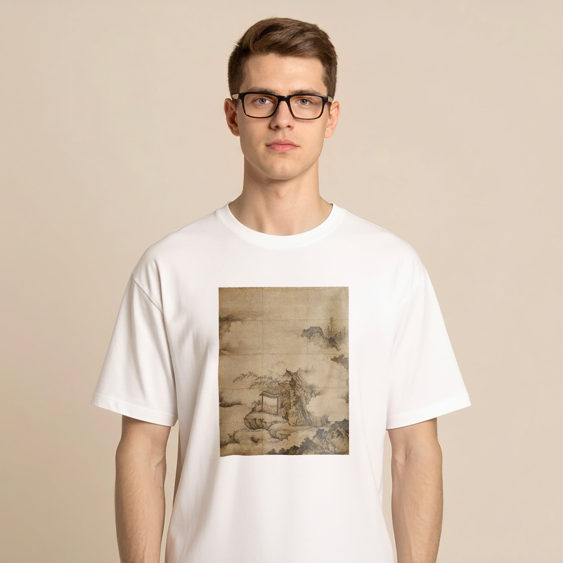 This painting depicts a story of Zen monks from the Tang dynasty. It is inspired by the tale of Kyōgen, a monk and gravekeeper who achieved enlightenment upon hearing the sound of a pebble striking bamboo. The composition skillfully conveys a serene mountain setting, seemingly resonating with the echo of that sound.