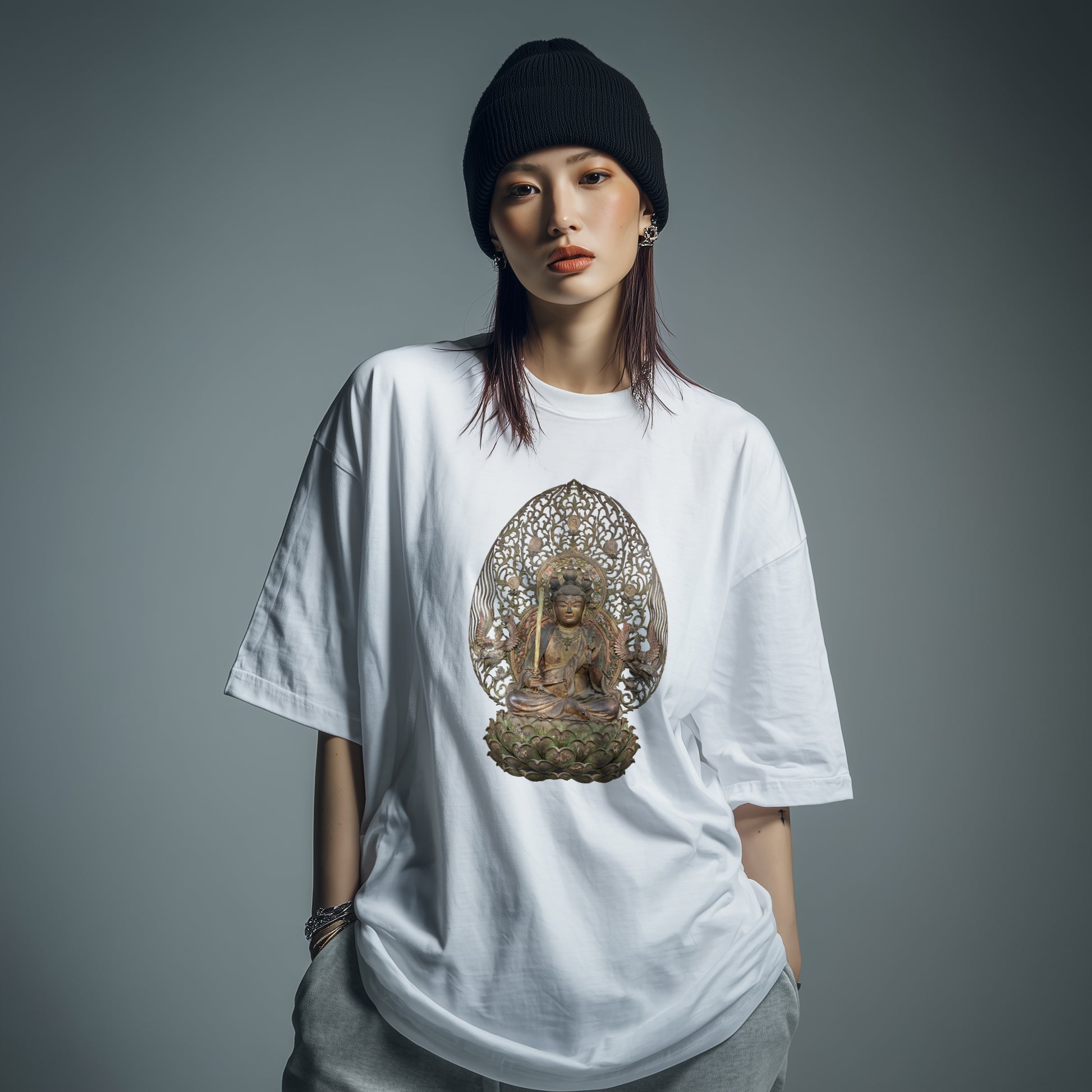 Monju Bosatsu, the Bodhisattva of Wisdom, is depicted with five knots in his hair, symbolizing pure, childlike wisdom. The pedestal is decorated with wave patterns, reflecting a uniquely Japanese interpretation of "crossing the sea," a motif commonly associated with the pursuit of wisdom.