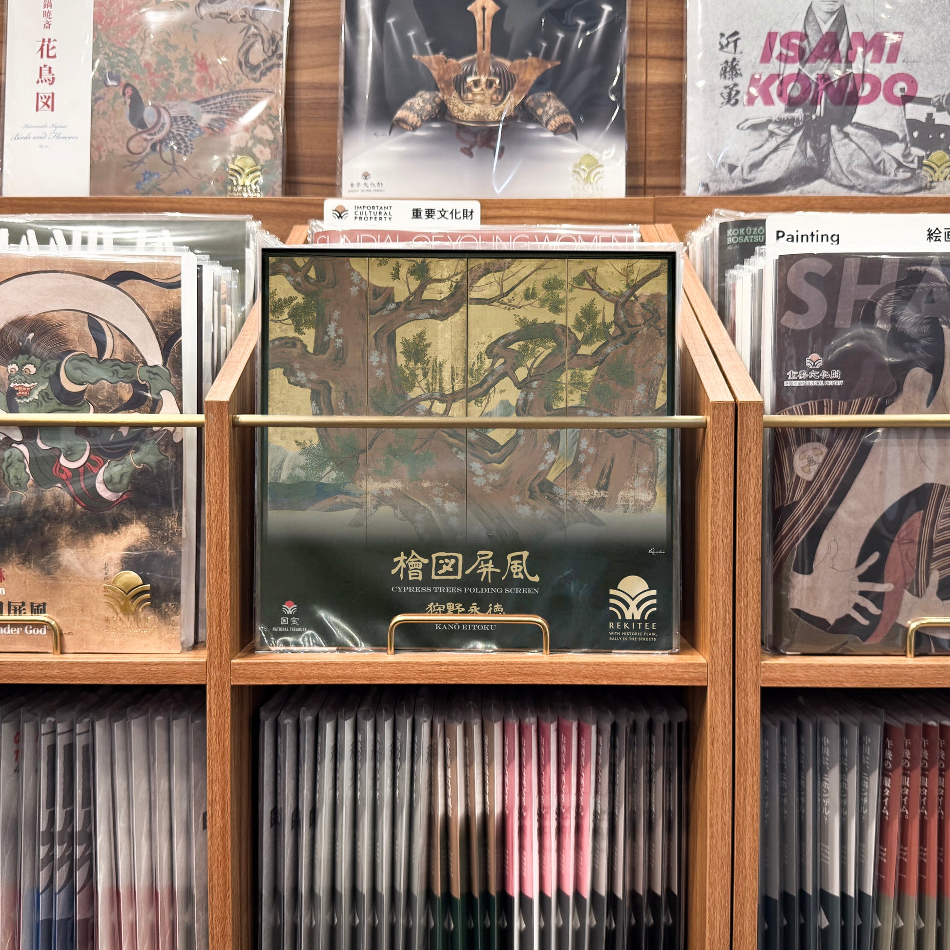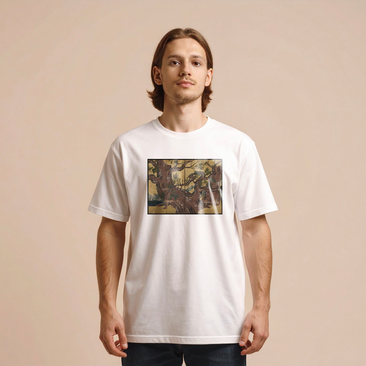 This folding screen boldly depicts a towering cypress tree with overwhelming presence. Its composition extends beyond the frame, with gold clouds at the top emphasizing the tree’s great height. Despite the limited palette—brown, ultramarine, gold, and verdigris—the dynamic energy of the ancient tree is vividly captured, reflecting the aesthetic sensibilities of Sengoku-period warlords.