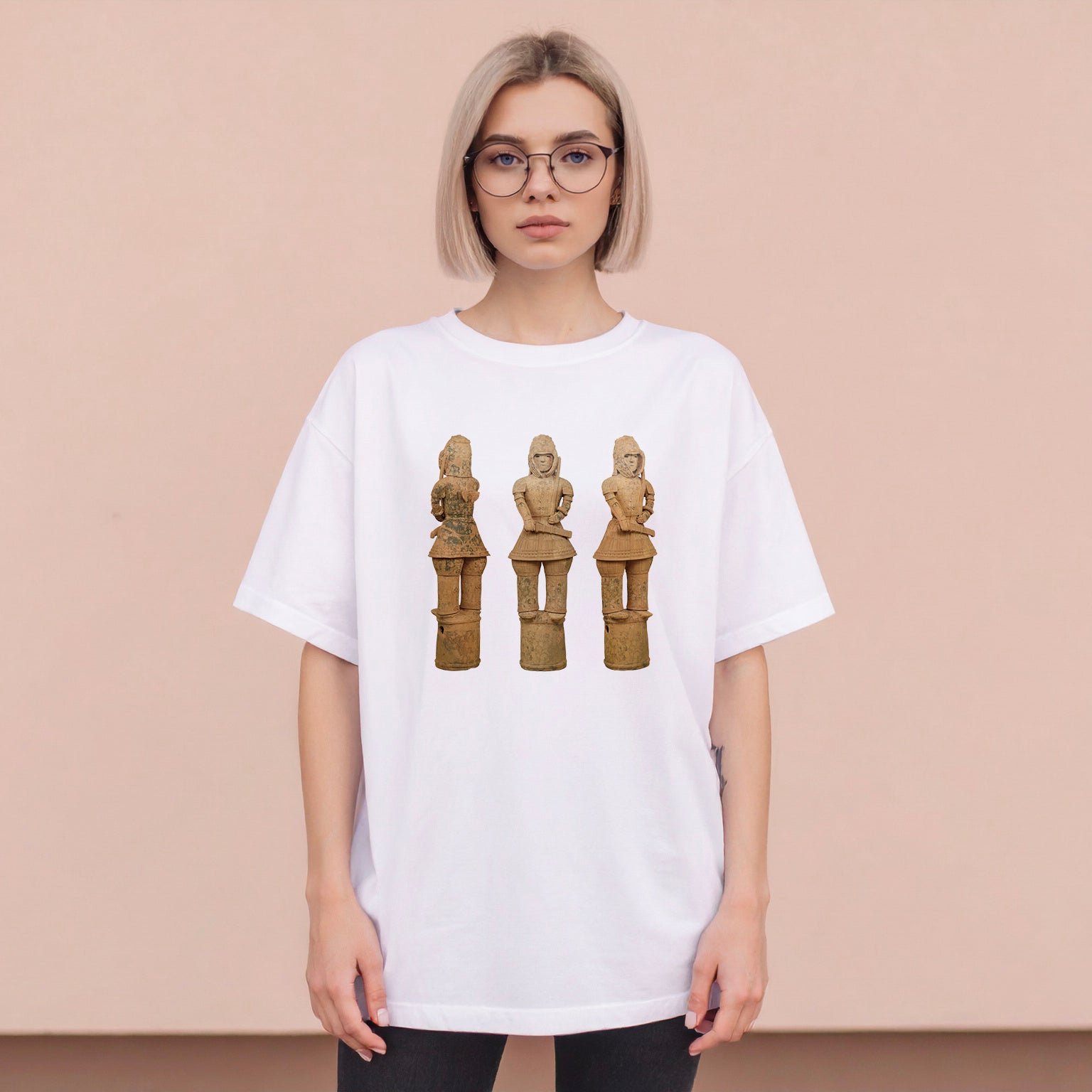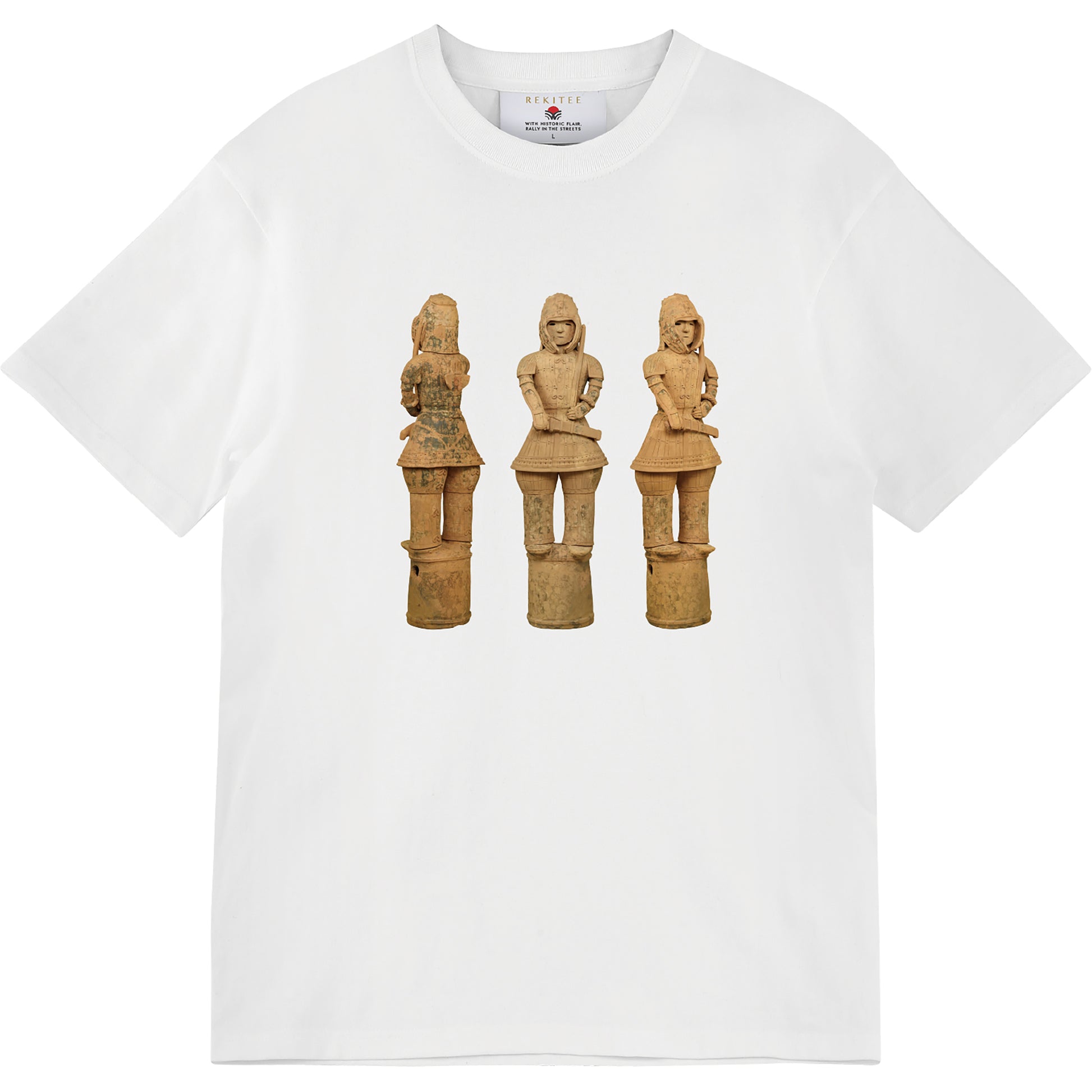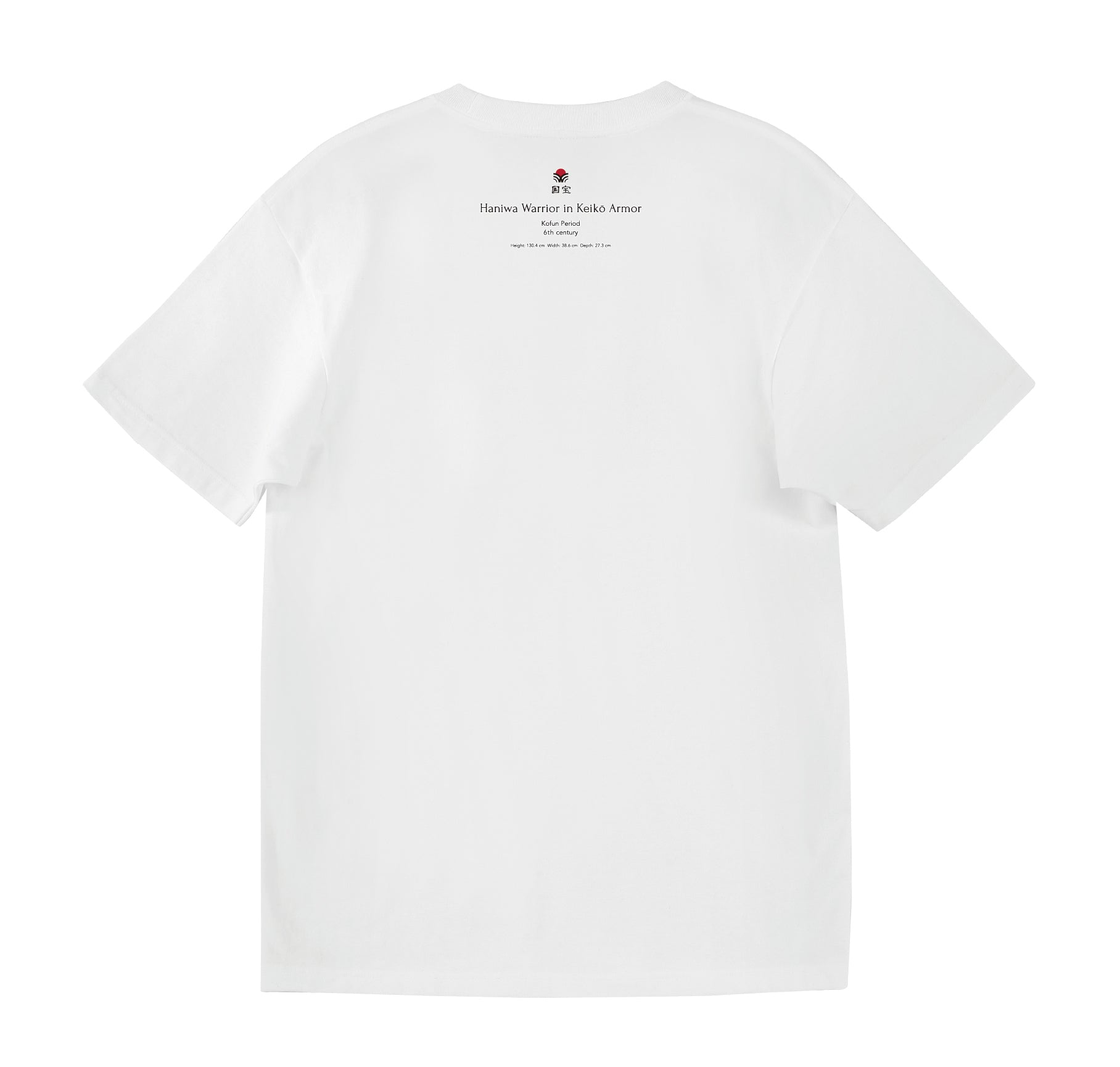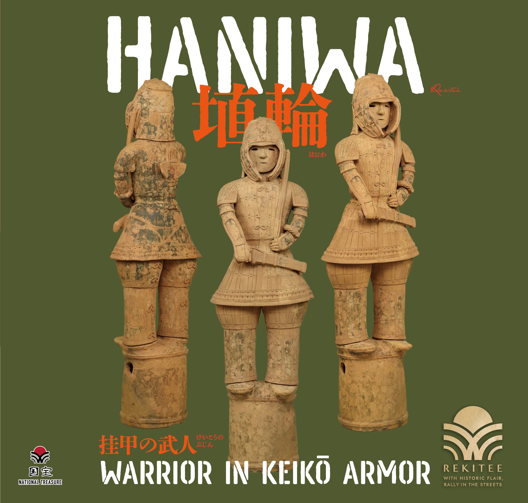Haniwa are terracotta clay figures that were created during Japan's Kofun period. This Haniwa shows us how warriors looked in ancient Japan. He is wearing keikō armor with a long, thick sword at his waist. His right hand is on the hilt, and his left holding a bow, with a quiver of five arrows on his back. This haniwa was originally painted colorfully in white, gray and red.