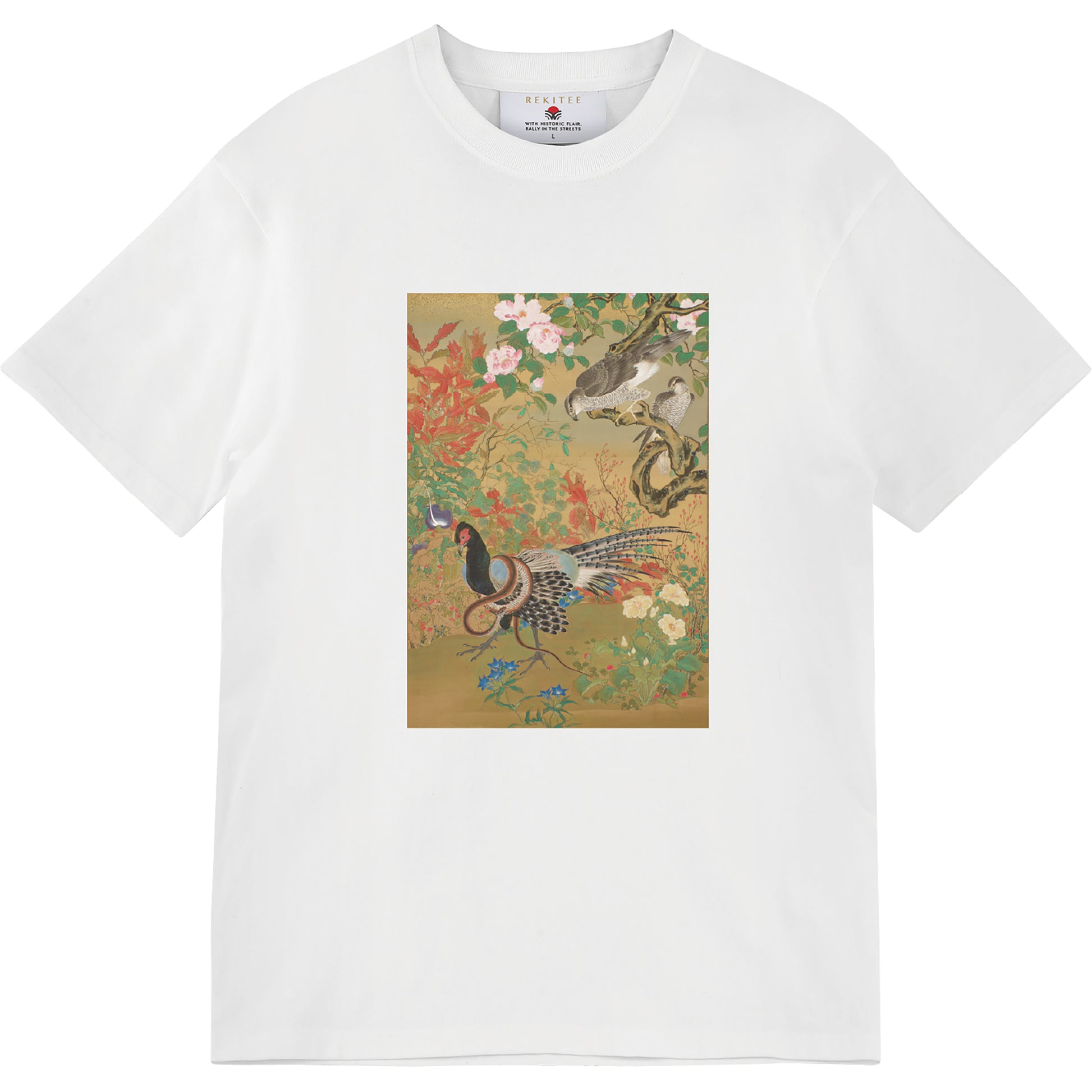 This gorgeous and beautiful work by Kawanabe Kyōsai depicts hawks and pheasants against a background of colorful flowers. However, a snake coiled around the pheasant on the ground, locking eyes with the hawks in the tree, gives an eerie impression. It reflects not only beauty, but also the complex and unconventional allure of Kyōsai's art.